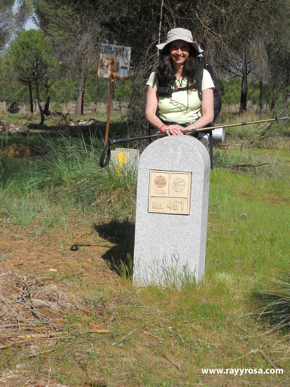 Pasamos por el punto kilométrico 491. Eso es lo que queda hasta Santiago. A nuestra izquierda una gran finca con un peregrino en piedra. Es el Caserío de Brazuelas.